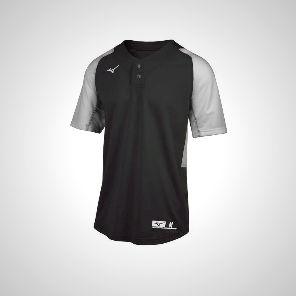 Mizuno Aerolite 2-button baseball jersey in black/grey for men. Lightweight, comfortable, and stylish. Available in sizes XS to XXL.