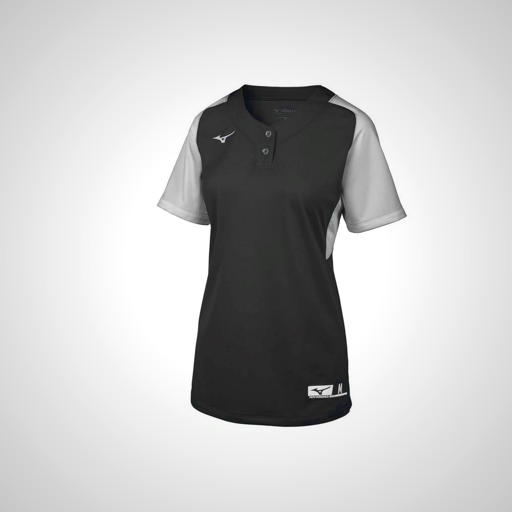 Mizuno Aerolite 2-button softball jersey for women. Features a lightweight design and comfortable fit in Black/Grey. Available in sizes XS to XXL.