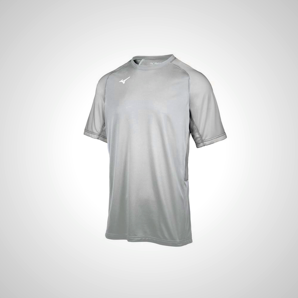 Grey Mizuno Aerolite Crew Baseball Jersey for men. Available in US sizes XS to XXL. Lightweight and comfortable design for active wear.