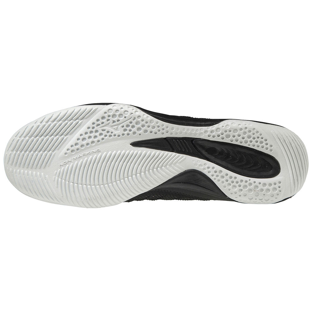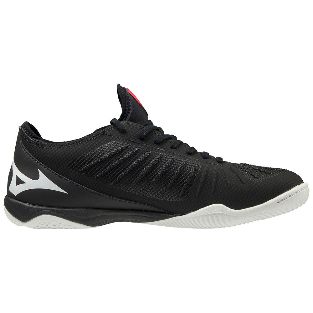 Mizuno Rebula Sala Elite indoor soccer shoes for women feature a sleek black and white design. Built for agility and comfort, they’re ideal for competitive play.